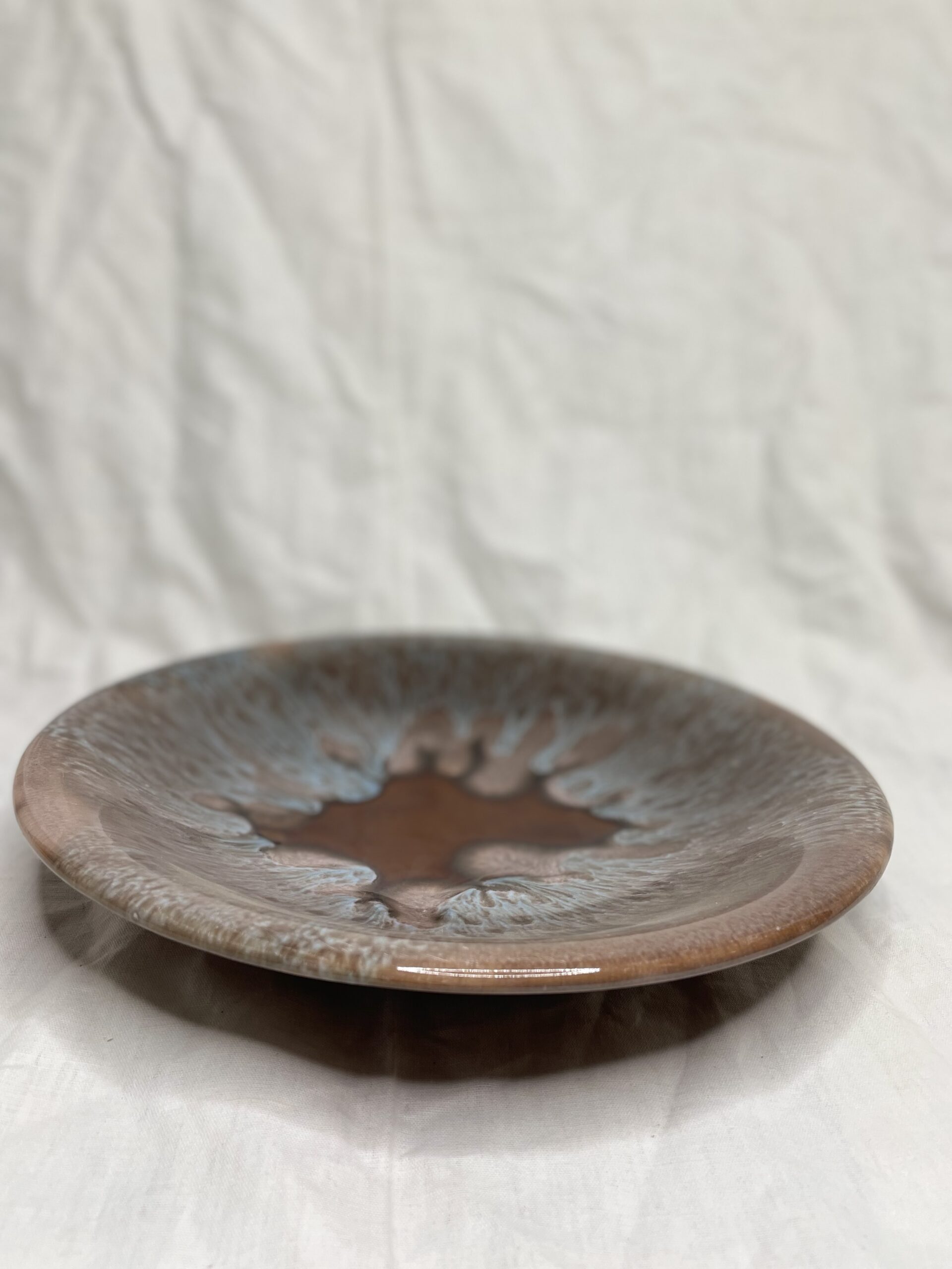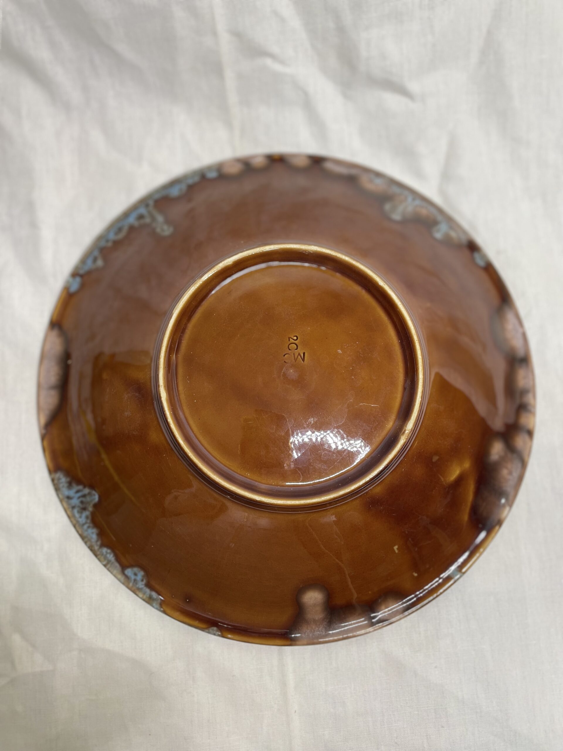 Dans un très bon état de conservation, cette grande assiette arbore des nuances marron et bleu qui lui confèrent un charme classique.