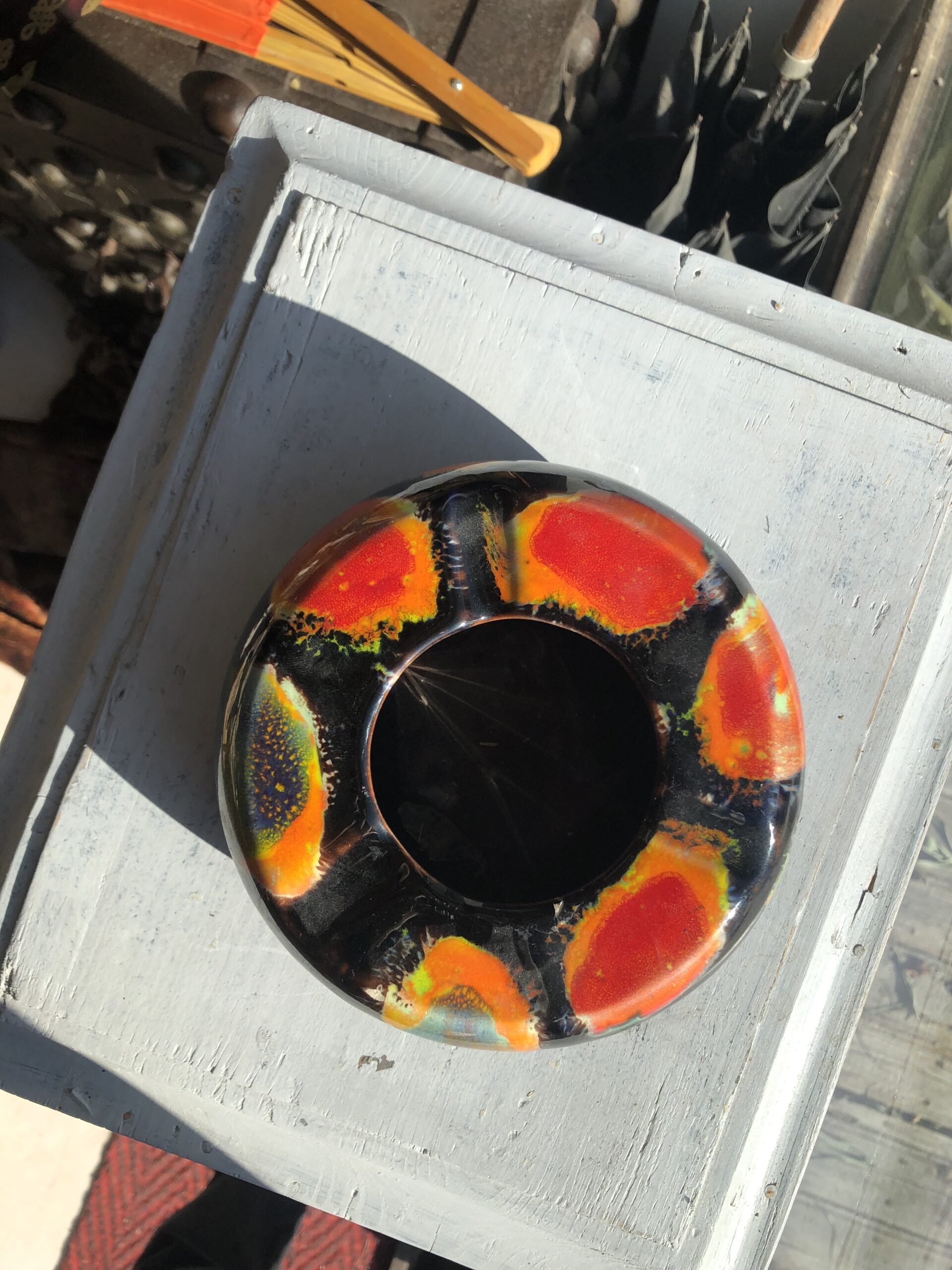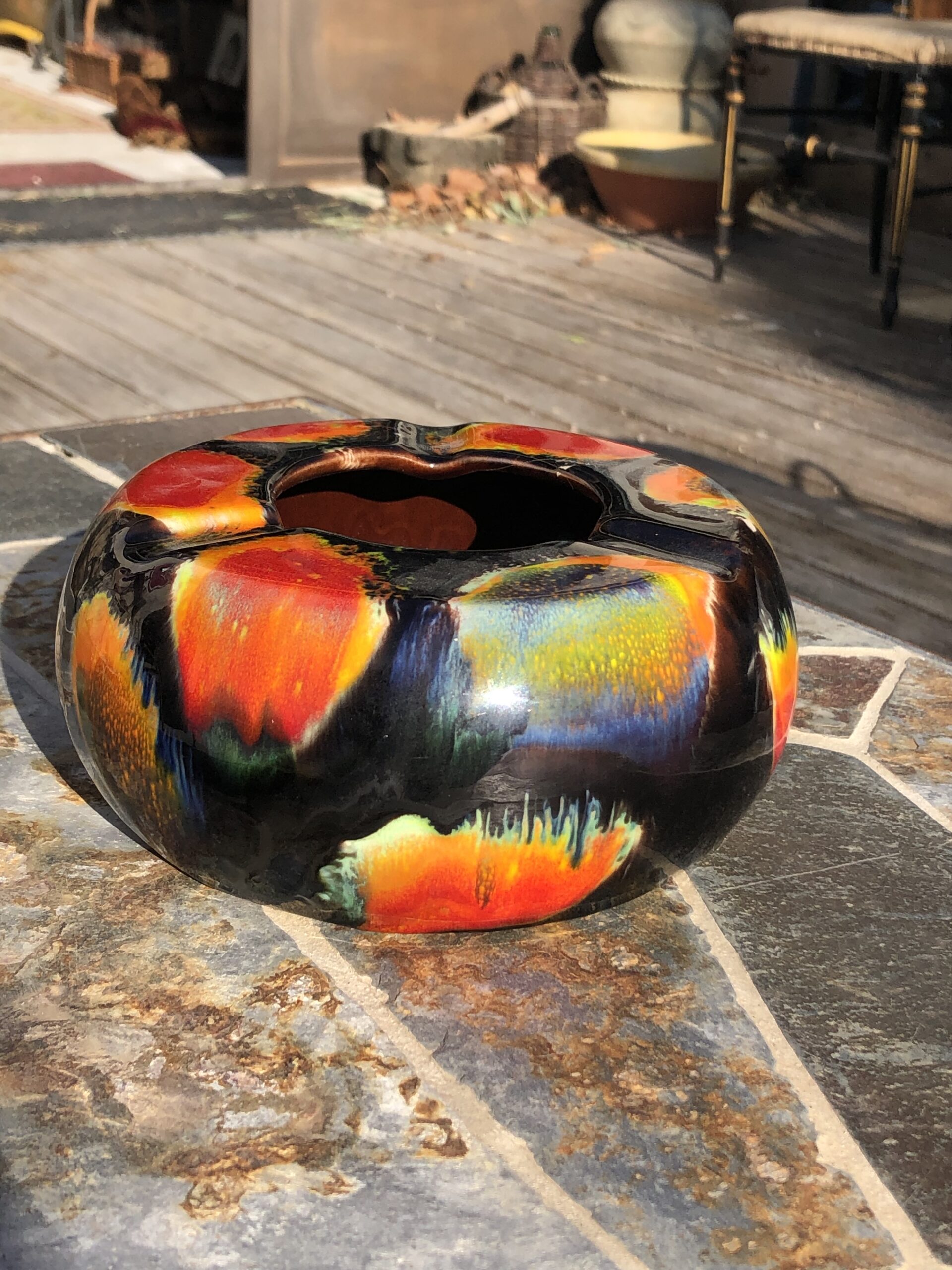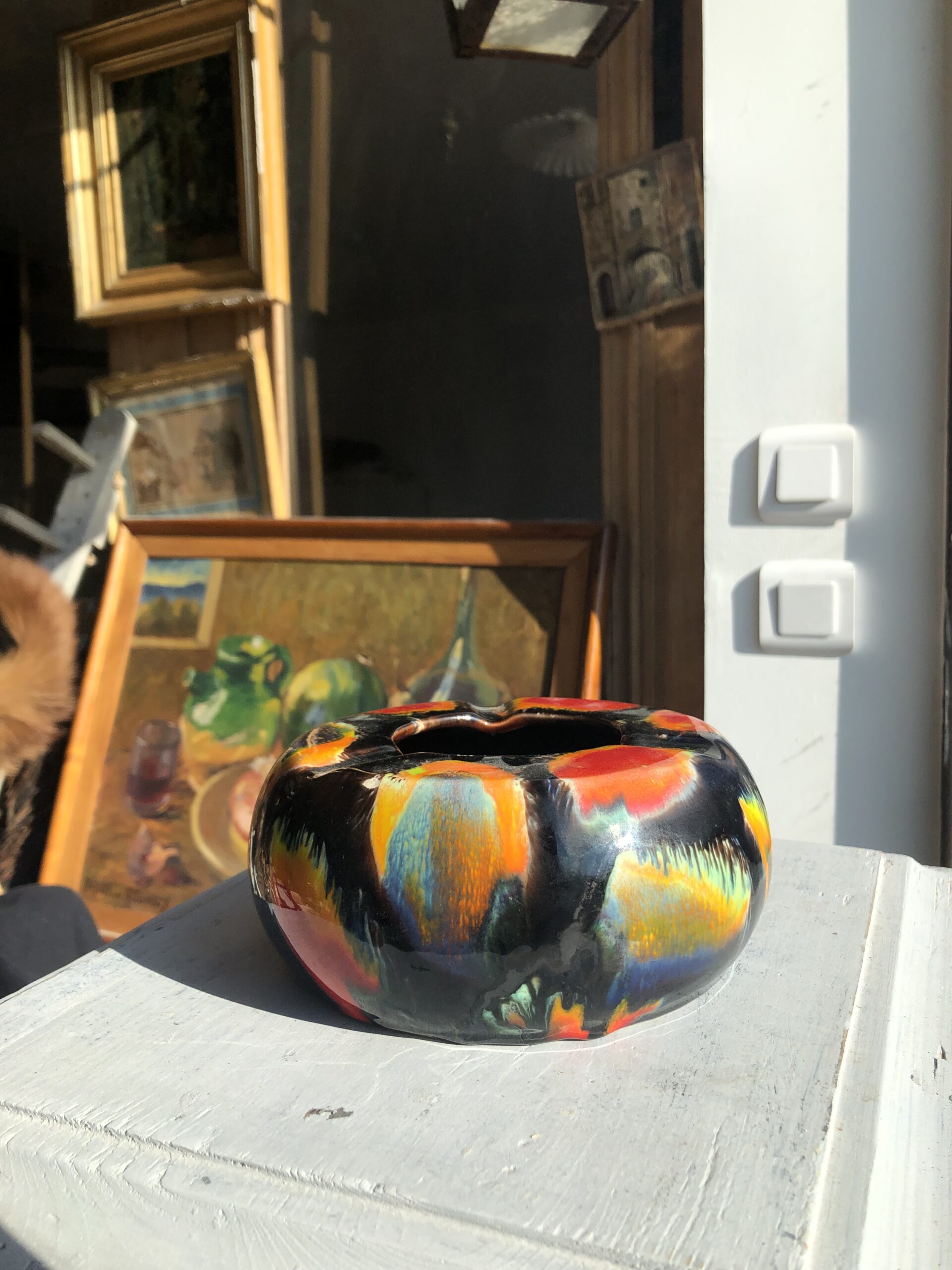 Très beau travail artisanal avec un jeu d’émail flamboyant typique de ces années, inspiré par la renommée de Vallauris.
