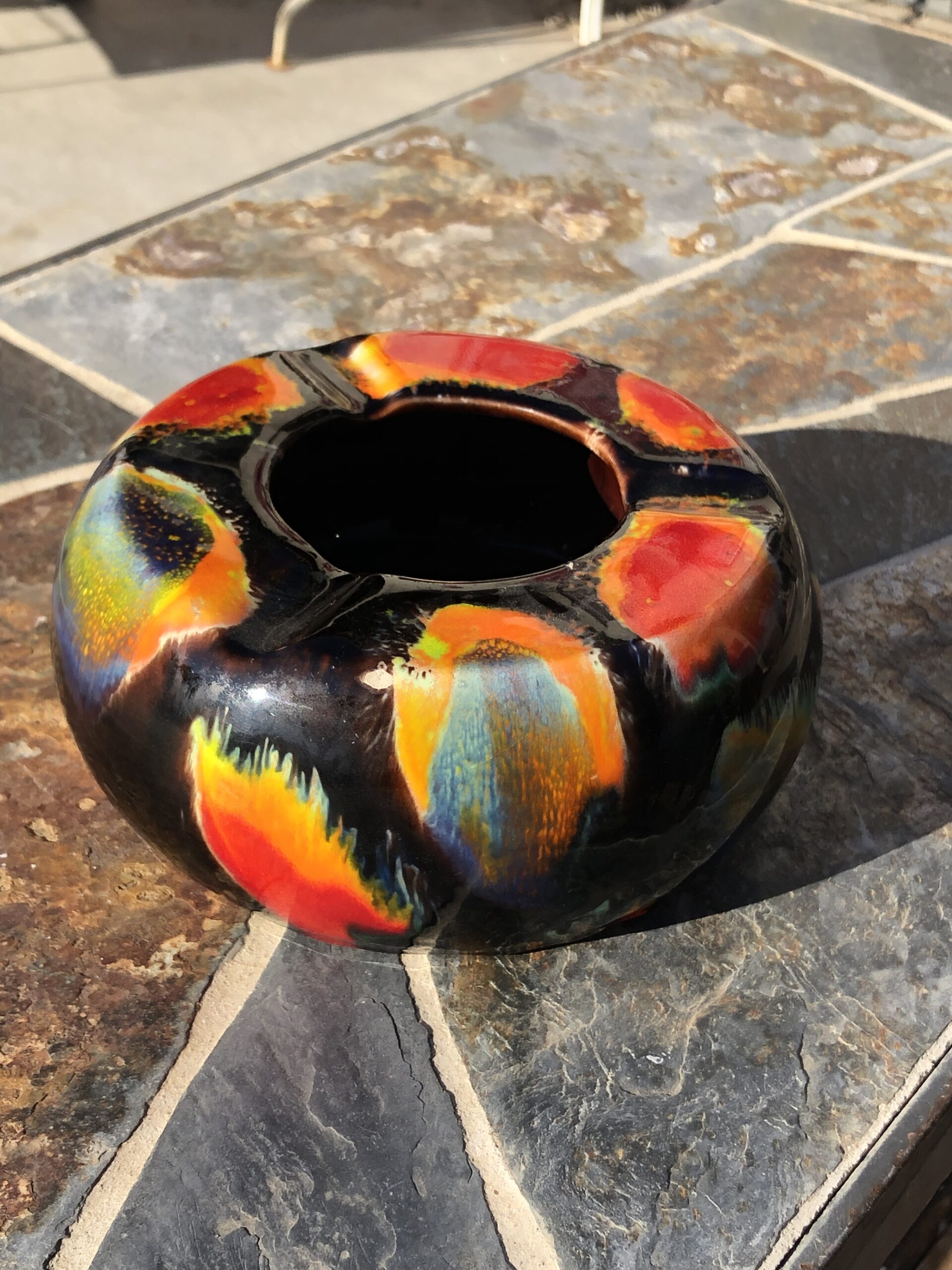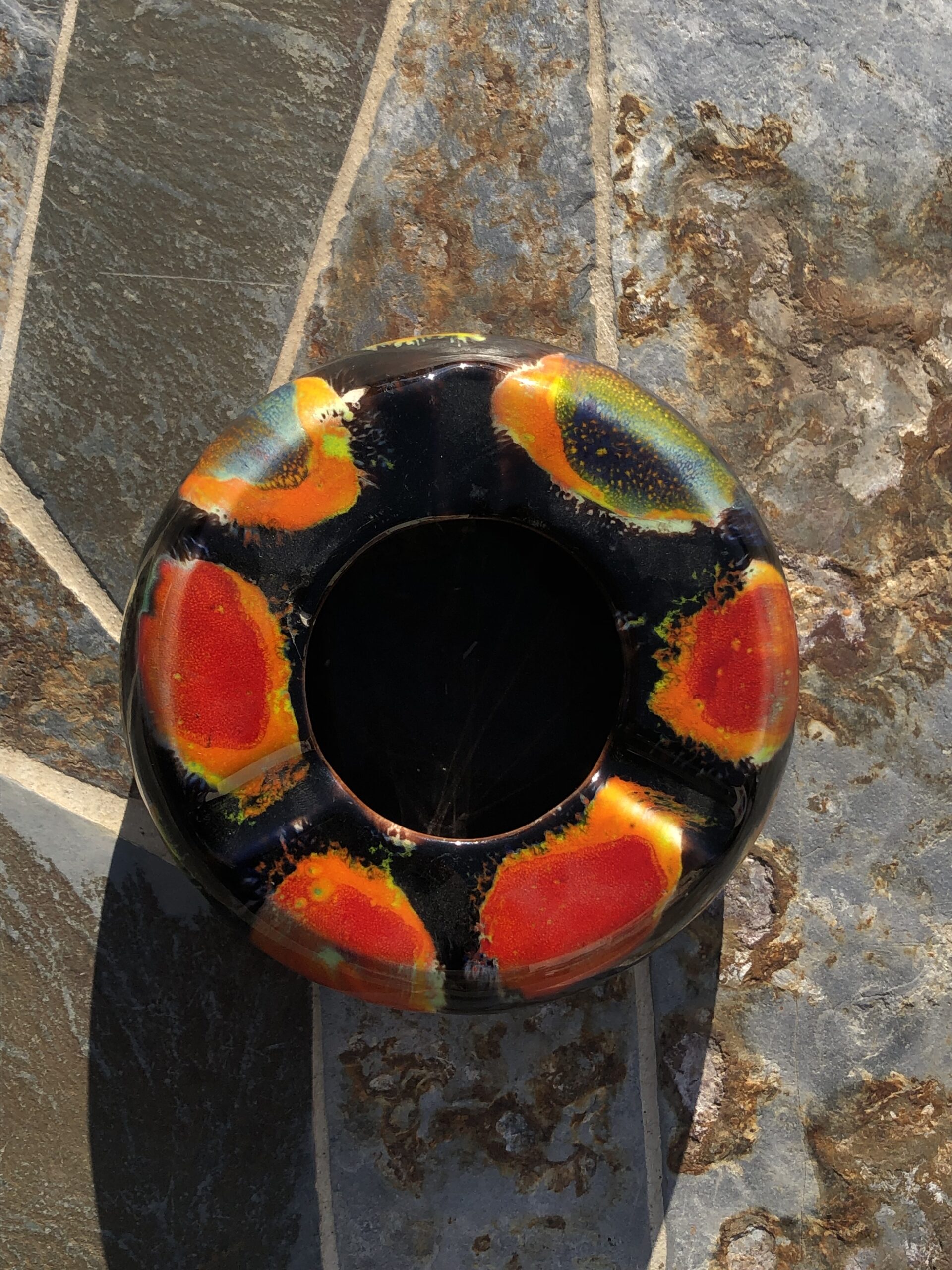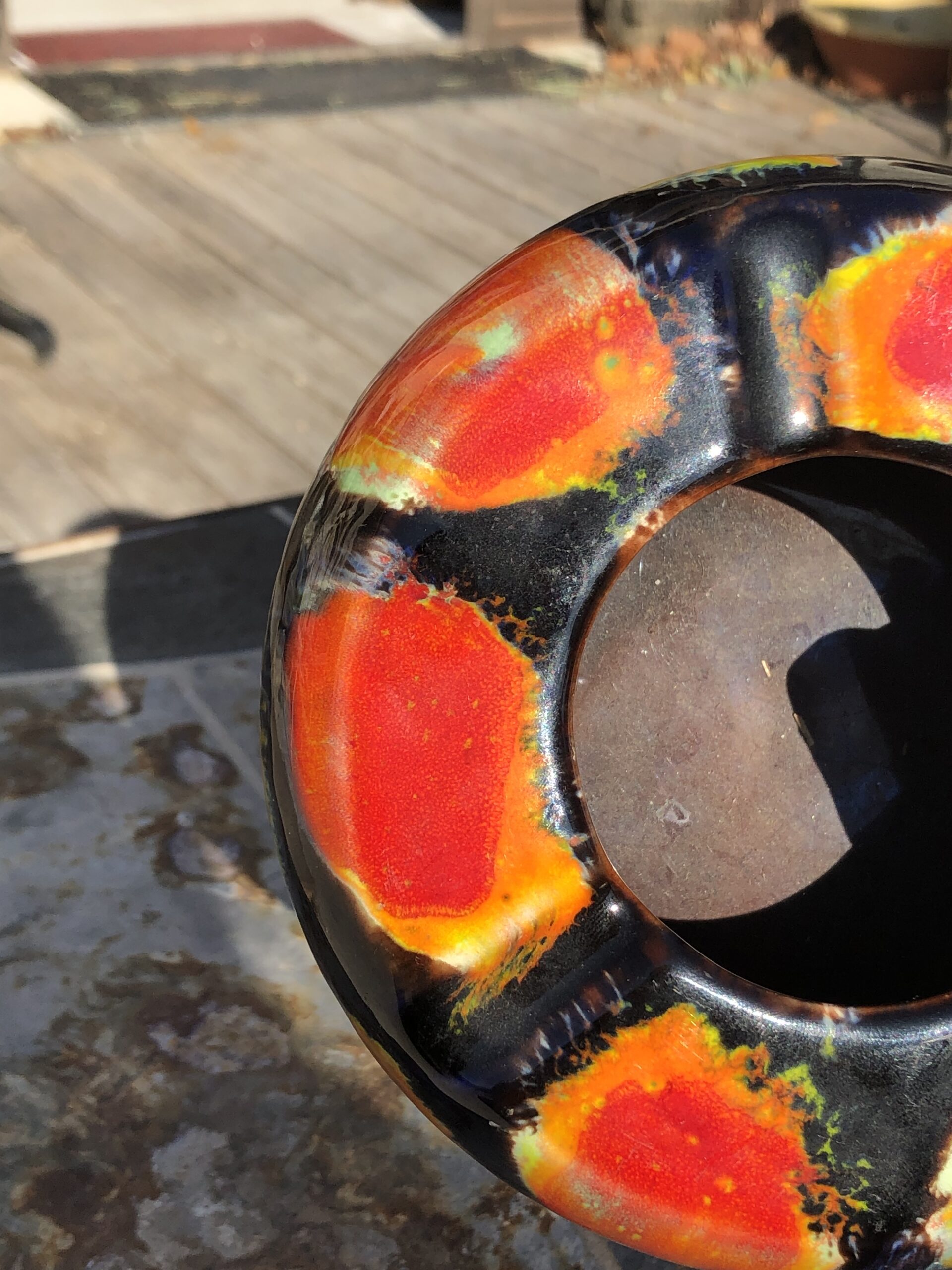 Très beau travail artisanal avec un jeu d’émail flamboyant typique de ces années, inspiré par la renommée de Vallauris.