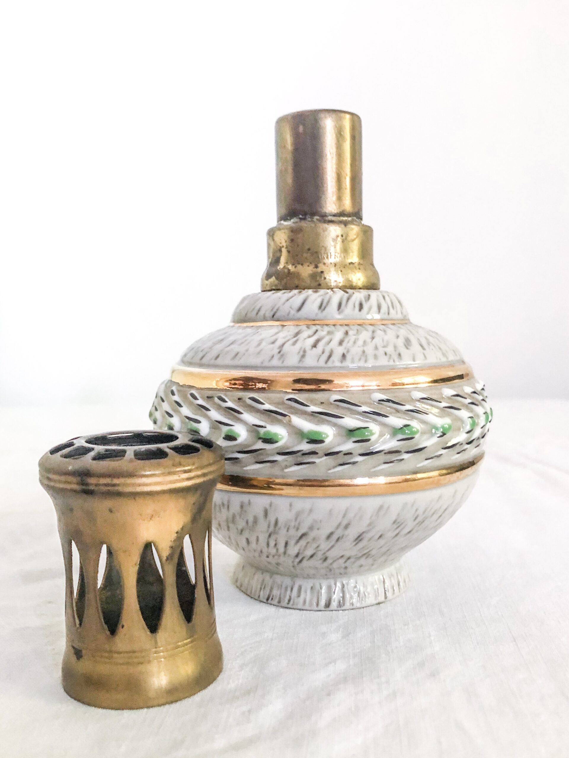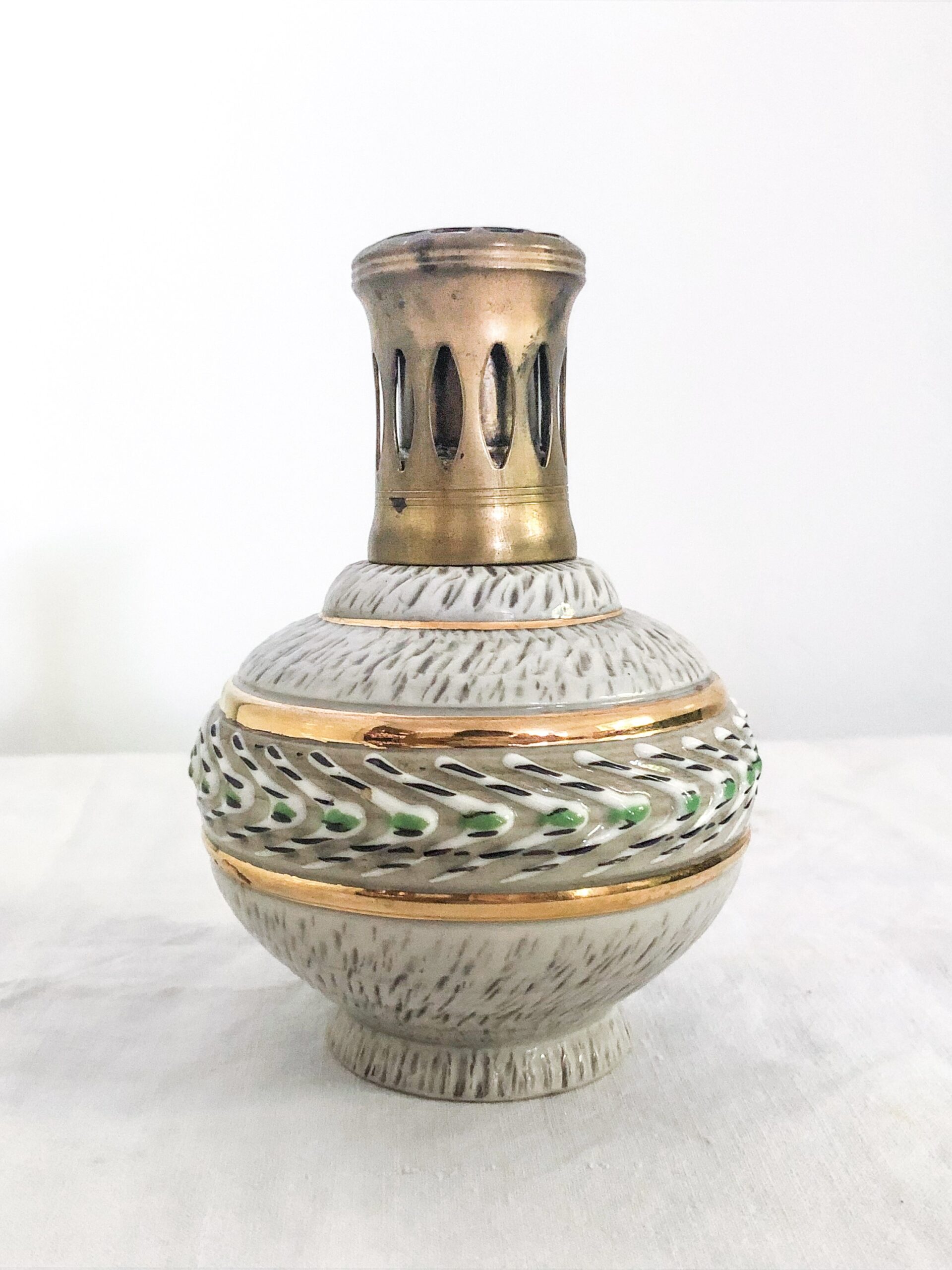 En parfait état, cette Lampe Berger en grès Breugot est finement décorée par des liserés dorés.