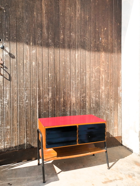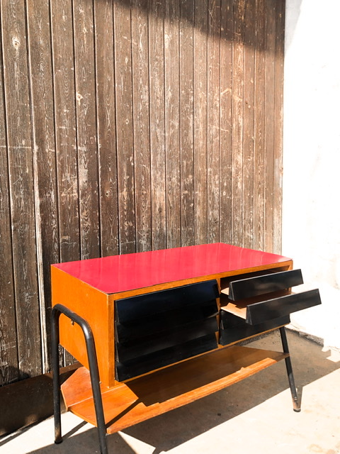 Il comporte 8 tiroirs formica noir et le dessus du meuble est rouge.