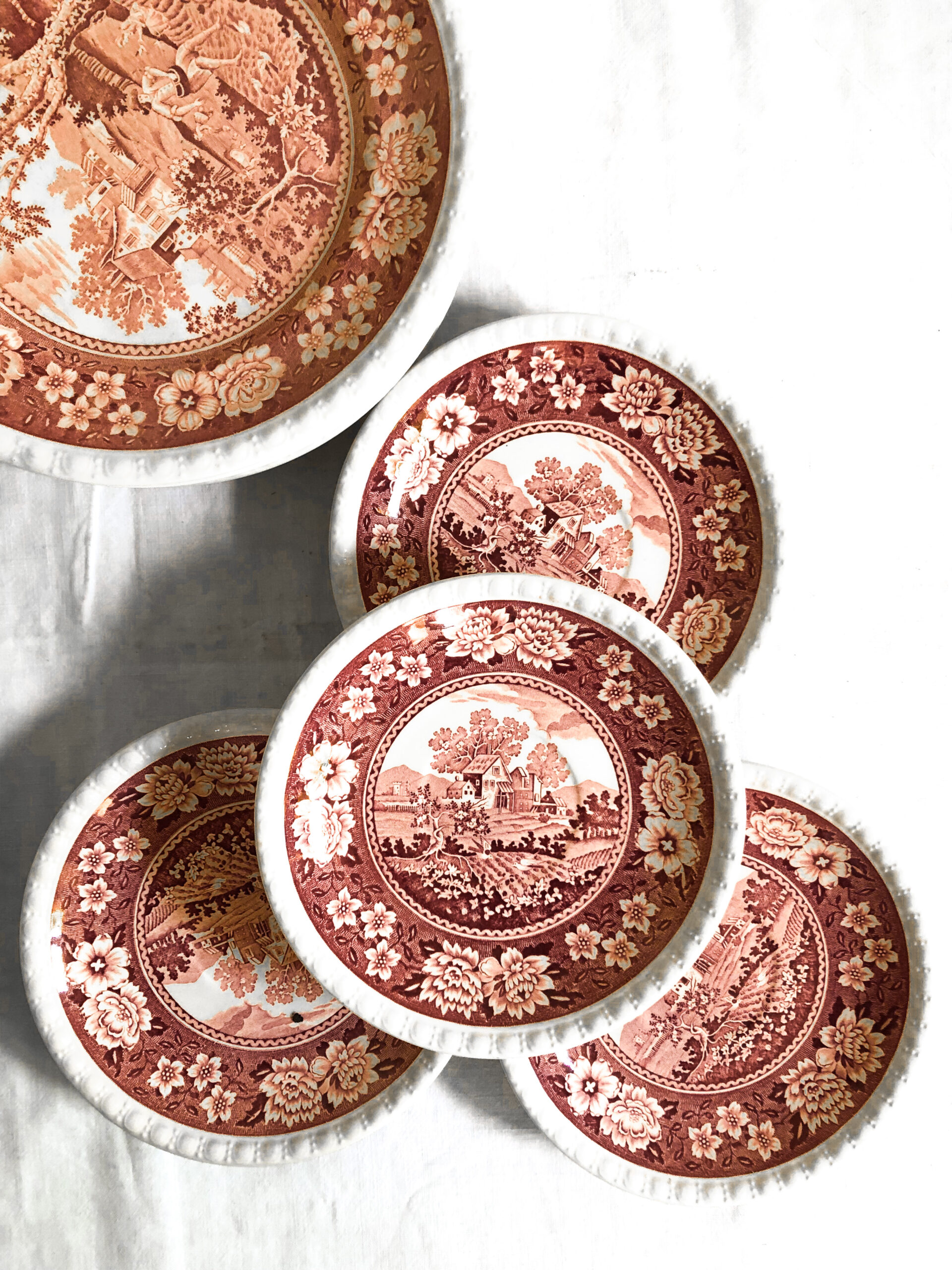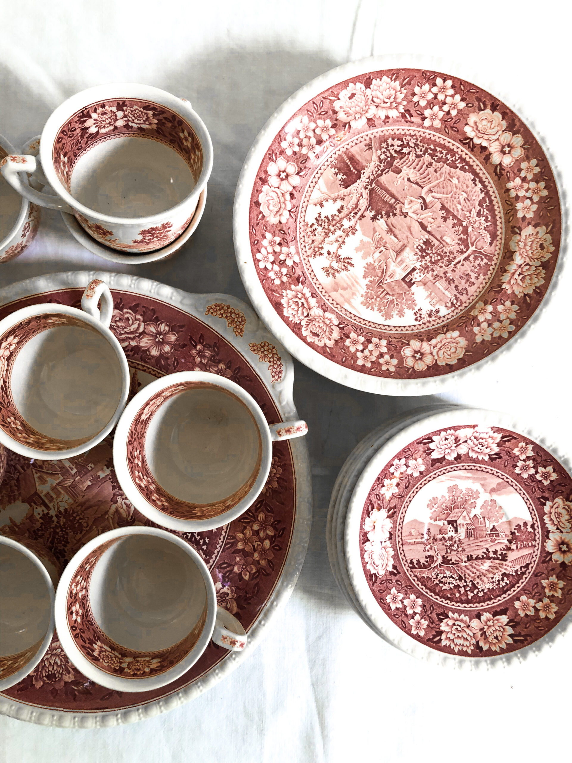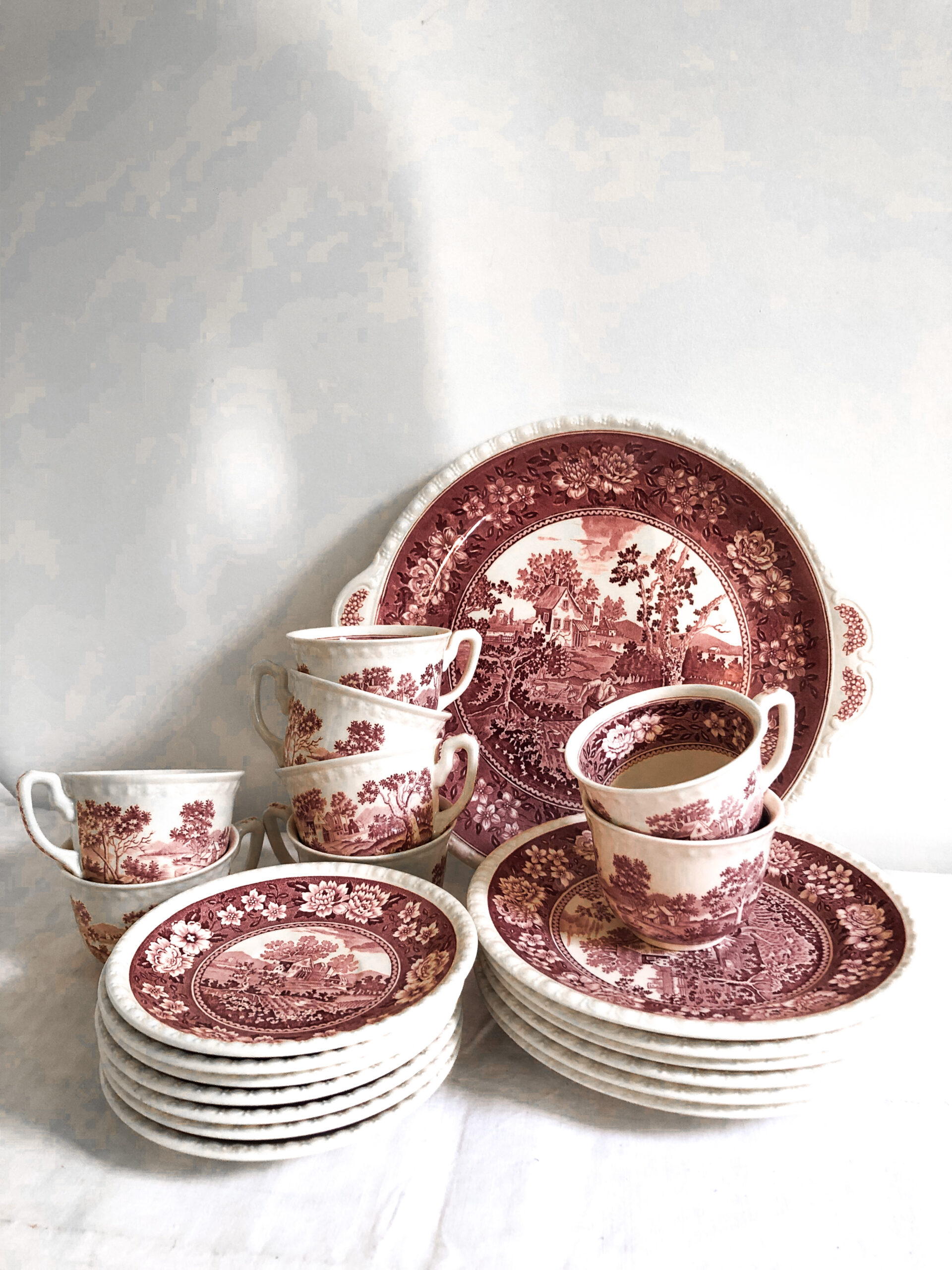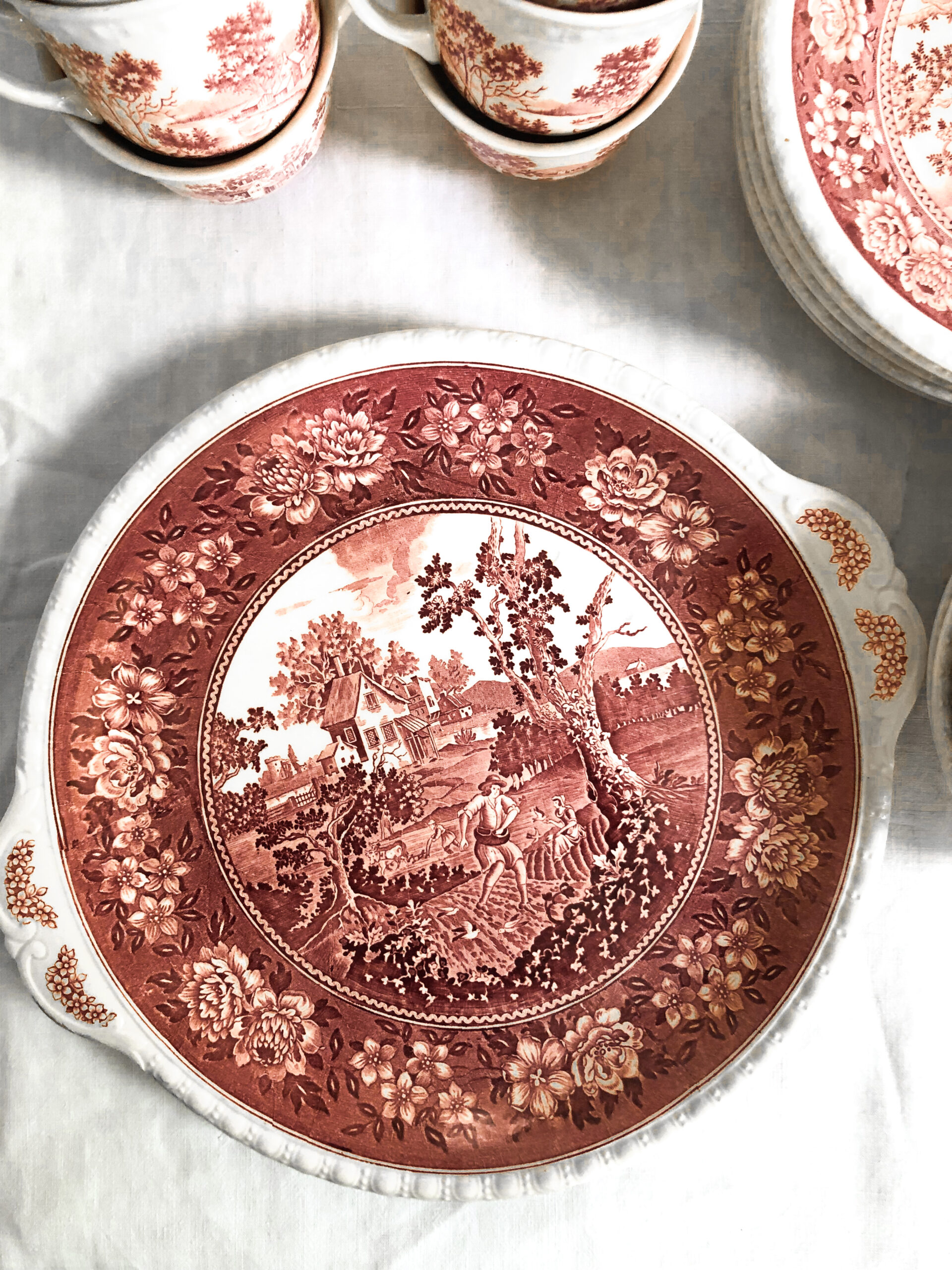 Ce service en porcelaine de la marque Villeroy & Boch, comporte 6 grandes assiettes, 7 petites assiettes/sous tasses, 8 petites tasses, un plateau à oreilles.